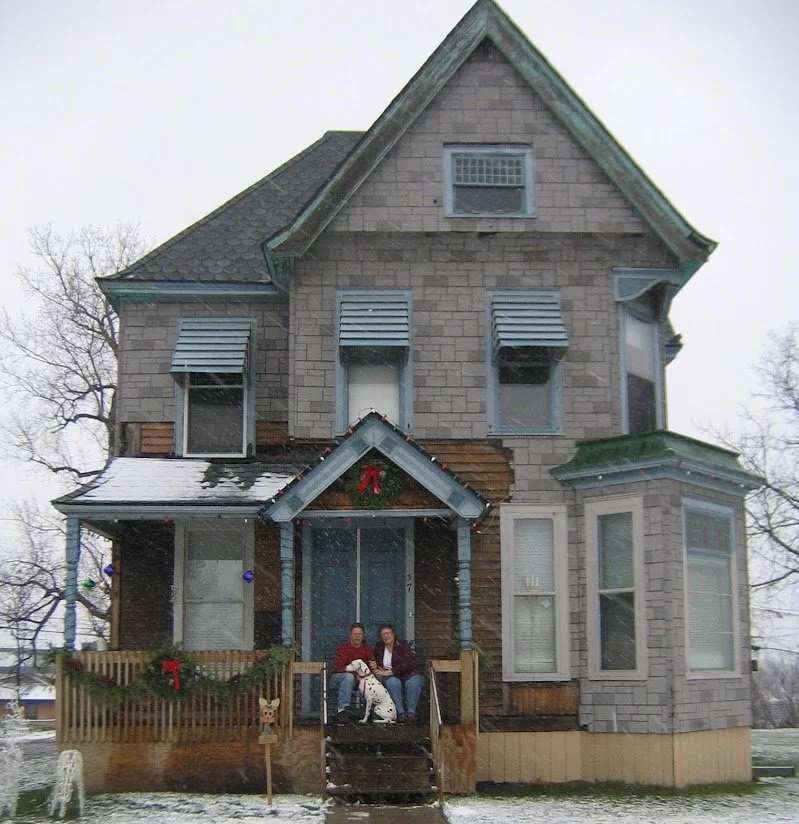 Do I need to describe its ugliness? The roof was replaced the first week we owned the home because gallons of water poured through the ancient shingles. The fascia . . . ? We really think the last paint was applied in 1950! That ugly gray siding is "depression brick", the moniker for asphalt rolled roofing formed to look like bricks. It was popular in the depression making it at least 60-70 years old. Not to mention that it was missing in a bunch of places! The windows leaked, didn't stay open, and were riddled with rotten wood. That horrible beige paint on the basement foundation should have stayed in the store!